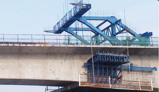 掛籃是滑動或滾動的承重構(gòu)架,錨固在橋梁上,含有行走軌道。在掛籃上可進行模板、鋼筋、預應力管道的施工,混凝土灌注和預應力張拉,壓漿等作業(yè)。完成一個節(jié)段的循環(huán)后,掛籃即可前移并再次固定,進行下一階段的懸澆。一直到主跨完成并且合攏;
